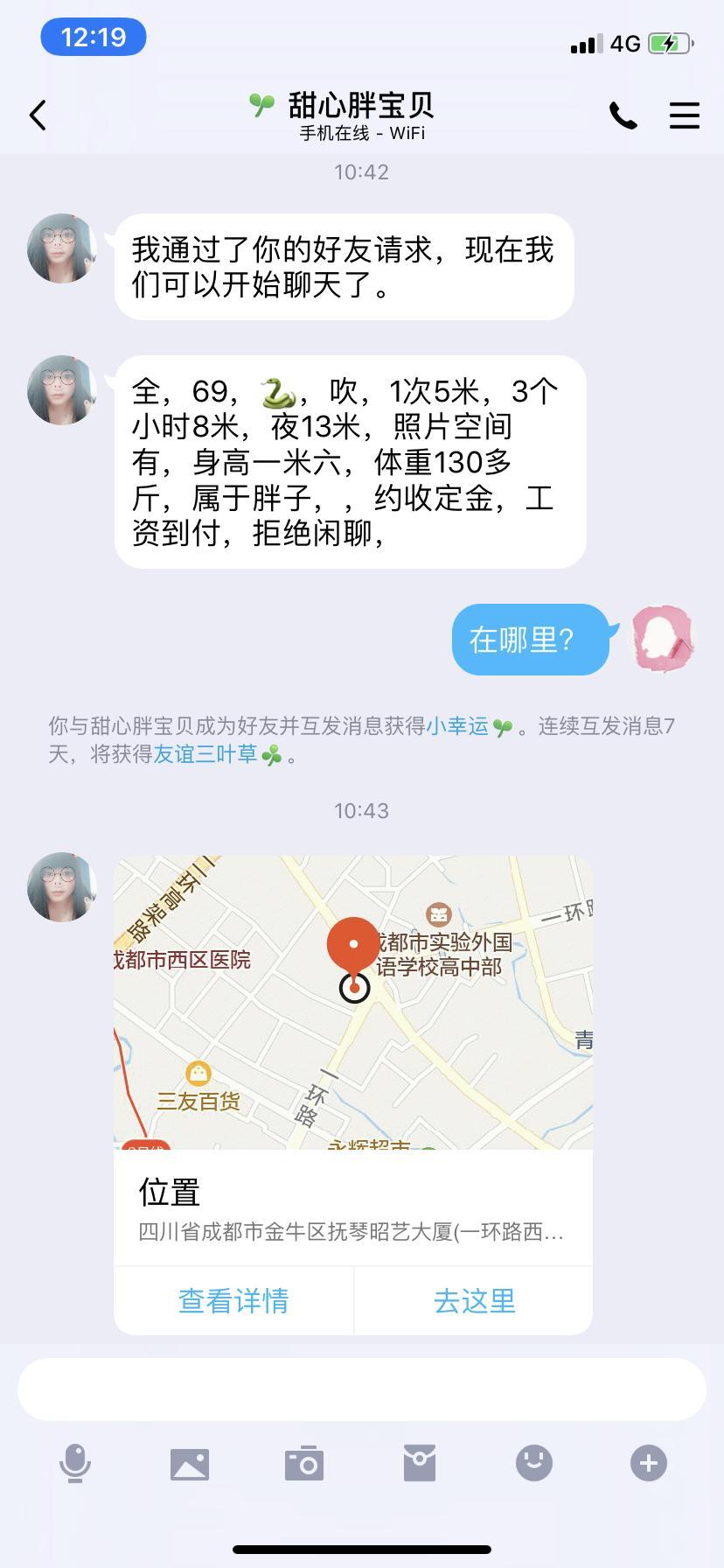 刚到成都出差下了飞机看了下之前加了一个群,里面妹子很多一番筛选后挑了这个妹子璐璐,提前联系好以后到达